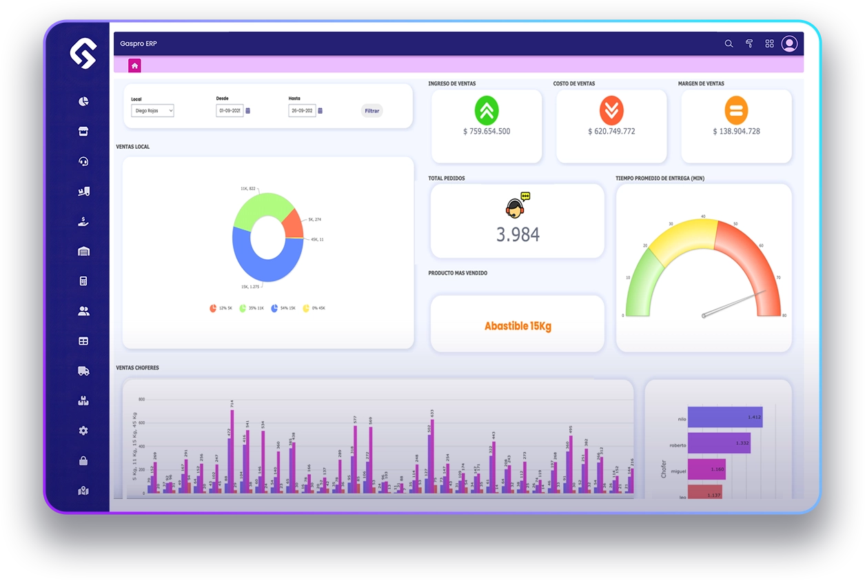 GASPRO ERP integra ventas, inventario, logística y finanzas en la nube, centralizando cada proceso de tu distribuidora. Obtén control total, reportes automáticos, trazabilidad de clientes y datos en tiempo real para tomar decisiones seguras y hacer crecer tu negocio con eficiencia.